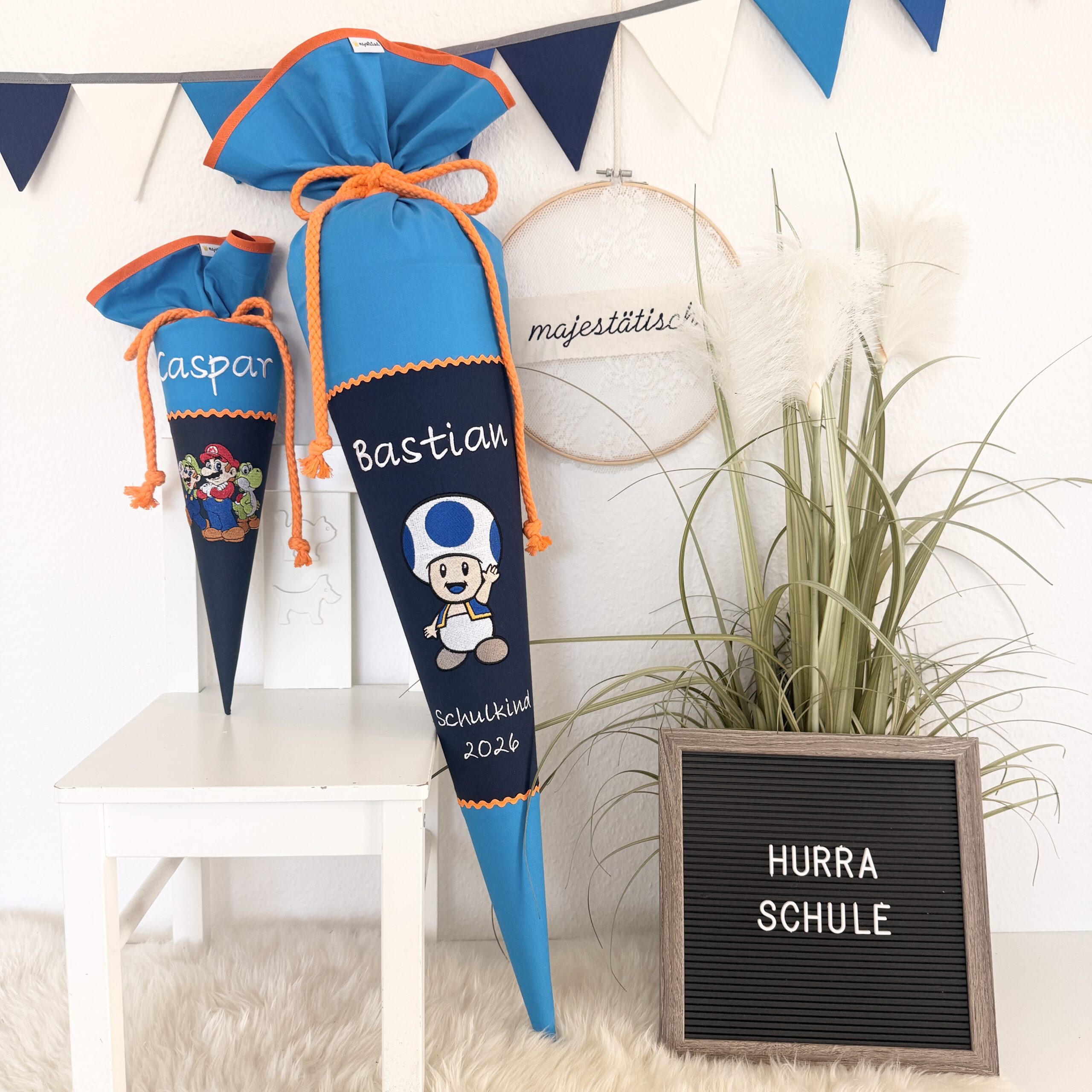 • Schultütenüberzug Geschwisterschultüte mit Name, Papprohling 35cm, Kordel zum Verschließen