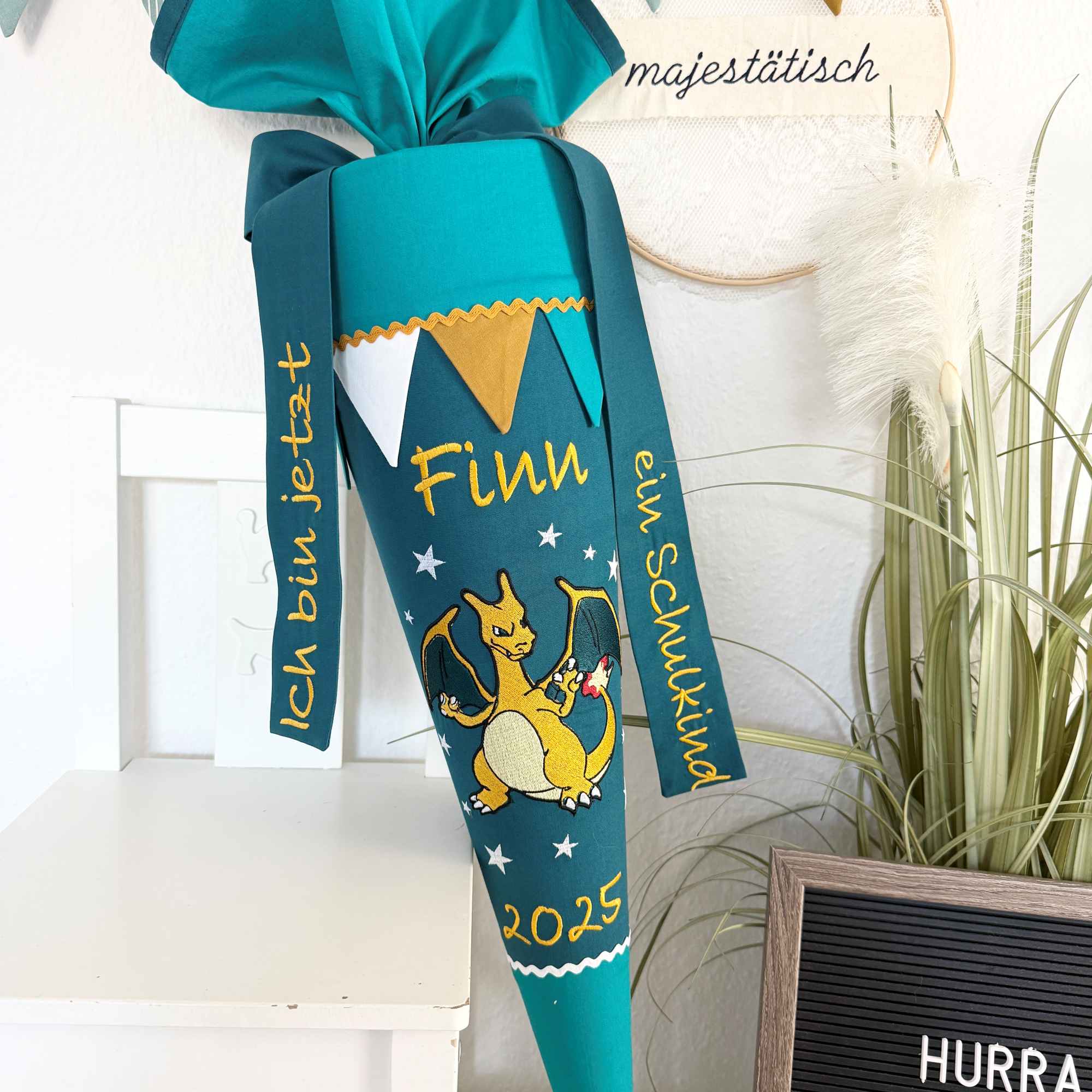 • Schultütenüberzug aus Baumwolle und Stickerei 95cm, Schleife zum Verschließen der Schultüte, Papprohling Größe 70cm