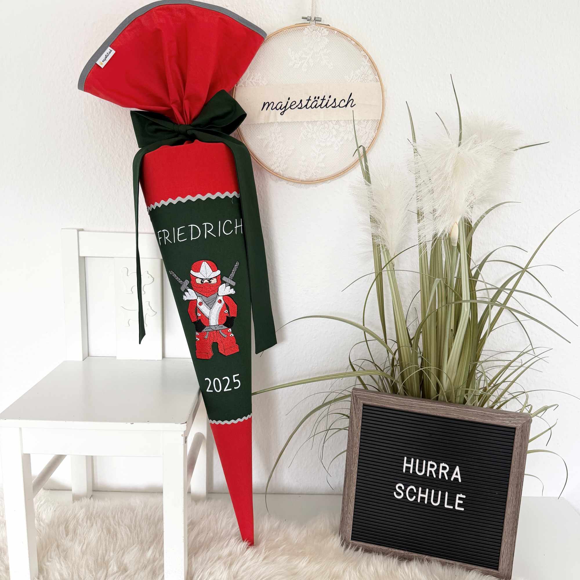 • Schultütenüberzug aus Baumwolle und Stickerei 95cm, Schleife zum Verschließen der Schultüte, Papprohling Größe 70cm